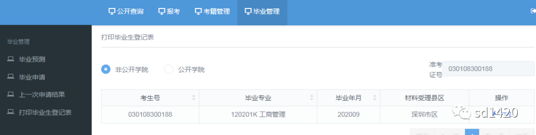 (七)在我市申请自考毕业的考生,打印毕业生登记表时,登记表类型请选择“非公开学院”,然后按提示将《毕业生登记表》用A4纸双面打印,一式两份,考生不得对《毕业生登记表》的内容及格式作任何更改。