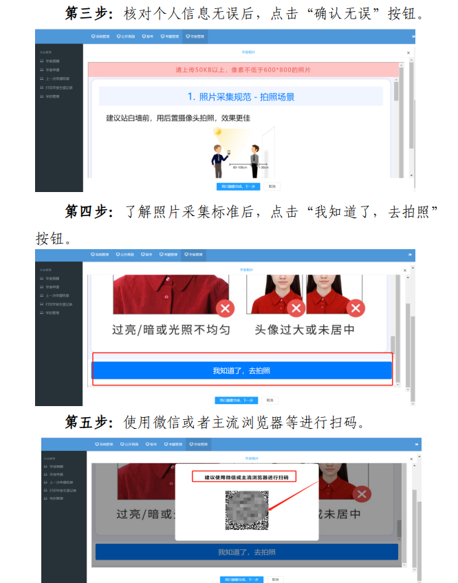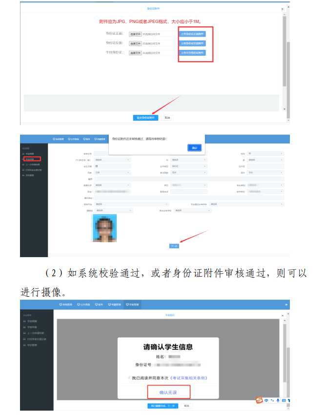考生登录系统申请毕业时,由系统将采集的图像与考生信息数据库关联校验,并与公安部门人口库等权威渠道开展图像比对,以确保图像信息的准确性与一致性。图像采集规范及信息标准详见附件2,采集操作流程详见附件3。