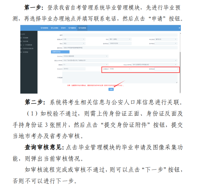 (六)考生提交毕业材料后,最终审核结果以省考委复核为准。请随时留意省审核结果,如对审核结果有异议请及时向我办或省反映。考生务必在广东省自学考试管理系统中正确填写本人的手机号码并保持通讯畅通,以便毕业审核期间发现问题时及时联系。