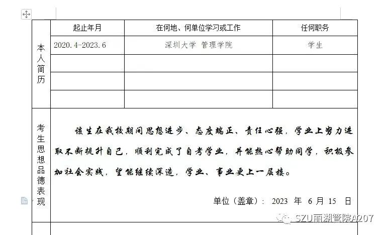 (八) 如实填写《毕业生登记表》背面的“本人简历”,同时将该表交有关单位填写考生的思想品德表现并盖章,不按要求填写及盖章的,毕业申请不予受理。