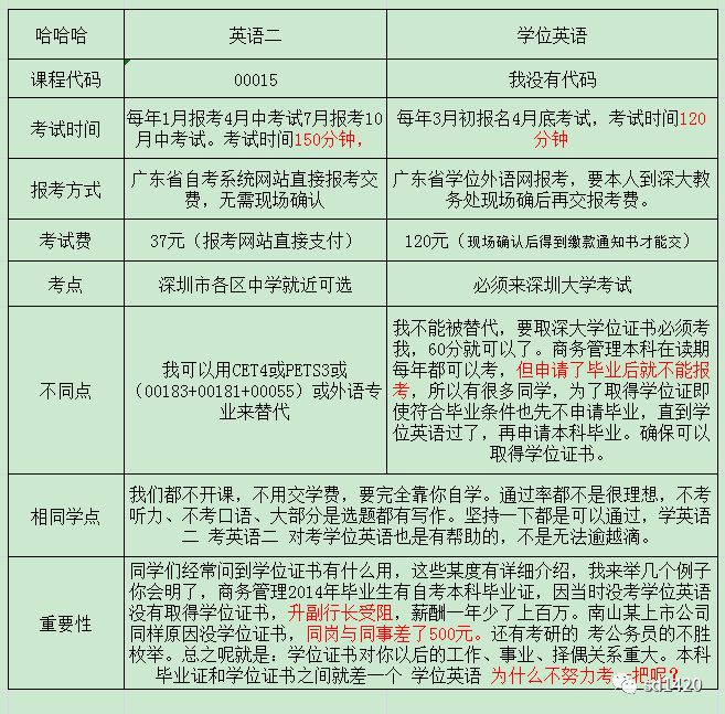 深圳大学管理学院高等教育自学考试本科工商管理专业有两门英语课,这两门英语课,别说新报名同学了,就是读了几年的老生也是要搞混的。所以在此 特再发一下。对比表如下