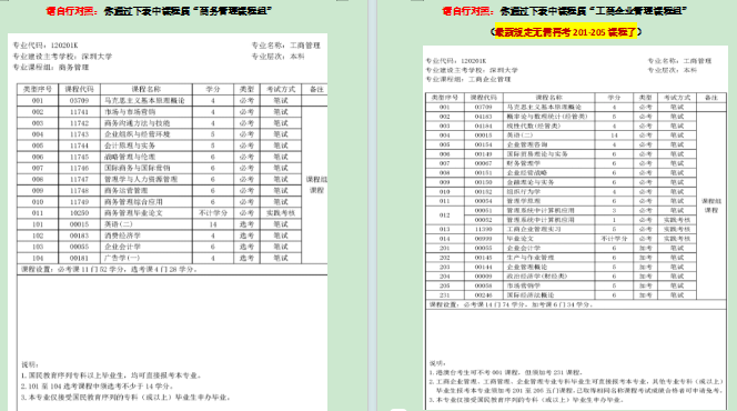 新政策规定:工商企业管理课程组(无需加考201-205课程)可申请毕业,请参见图表或附件中查看对照课程。